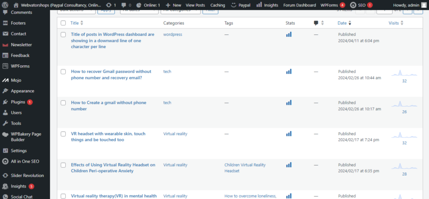 I will show you how to fix WordPress problem of title of posts  in the WordPress backend  showing in a downward line of one character per line. The Post Titles tend to appear in a vertical format, one character per line making dashboard terribly wrong and  hard to locate your posts. Its something which made me waste almost two weeks thinking it was plugins issue and it was not, I even updated the WordPress version but to no use. Below is a screenshot of the situation i was in ;  (You can click on image to see full image screenshot) SOLUTION What i did was simple. 1. When your in WordPress dashboard, click on “Screen Options” on the top right wordpress screen options location   2. Screen options will display some options, Tick off some options  . In my case i ticked of “AIOSEO Details”  which is loaded by  All in One Plugin. when i ticked off this, it created space for the post titles to stretch which were appearing vertical and the titles are fine now screen optionsOther options in screen options you can tick off include Tags, Author, Categories, date, Stats , etc, depending on Plugins you have in your website. The vertical post titles to appear vertical, collapsed or distorted is because the column space is not enough. ticking off some options will solve that. Some people try to  adjust the column width of the Post titles but this is not possible. You can adjust column width in WordPress dashboard by ticking off some features  in the screen options. If this article helped you, you can support us by subscribing on my Channel, click image link below